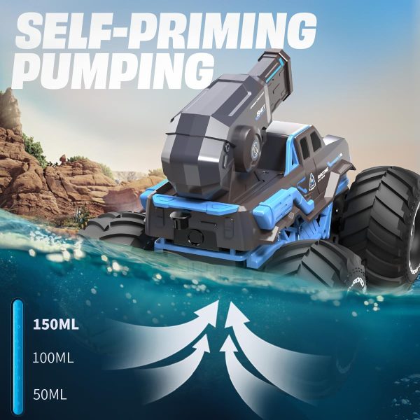 Two ways of water injection:There are two different ways of water injection ,When on the land, the water injection bottle can be added to the water injection hole behind the body and add water. The water tank capacity is 150ml; The holes will automatically absorb water during driving, and the water columns can be continuously erupted.