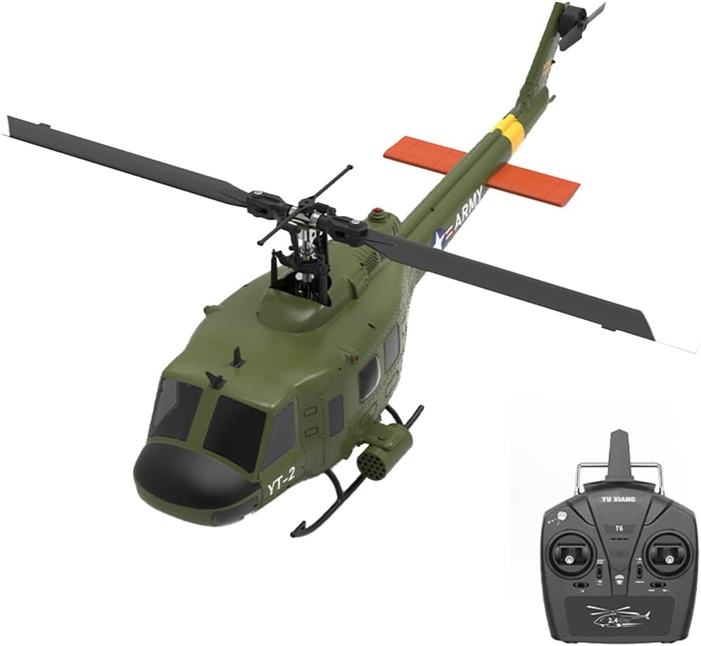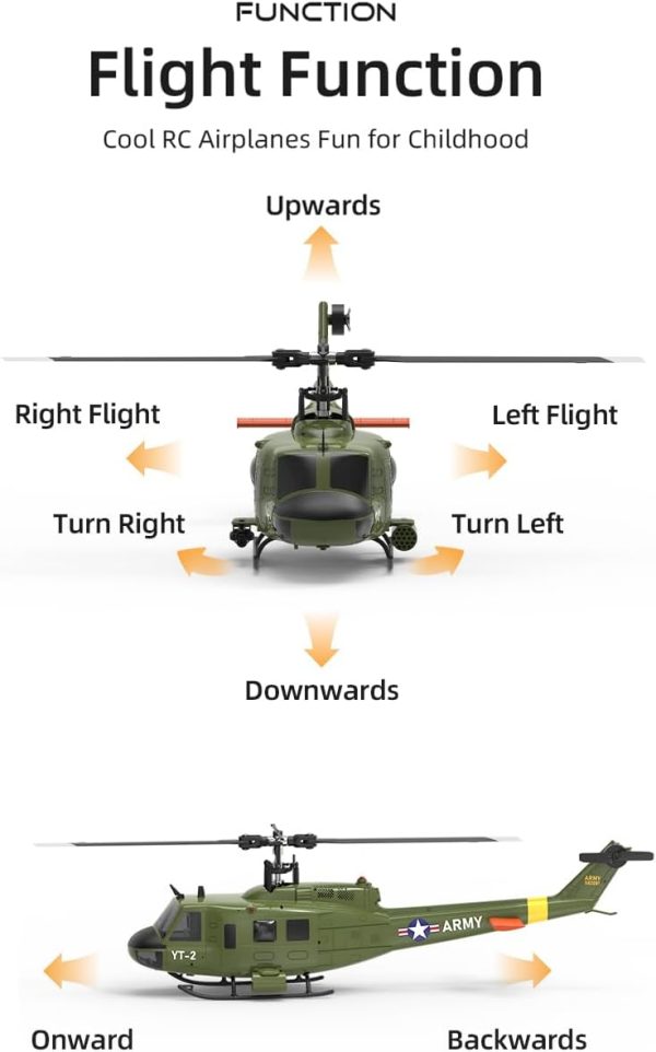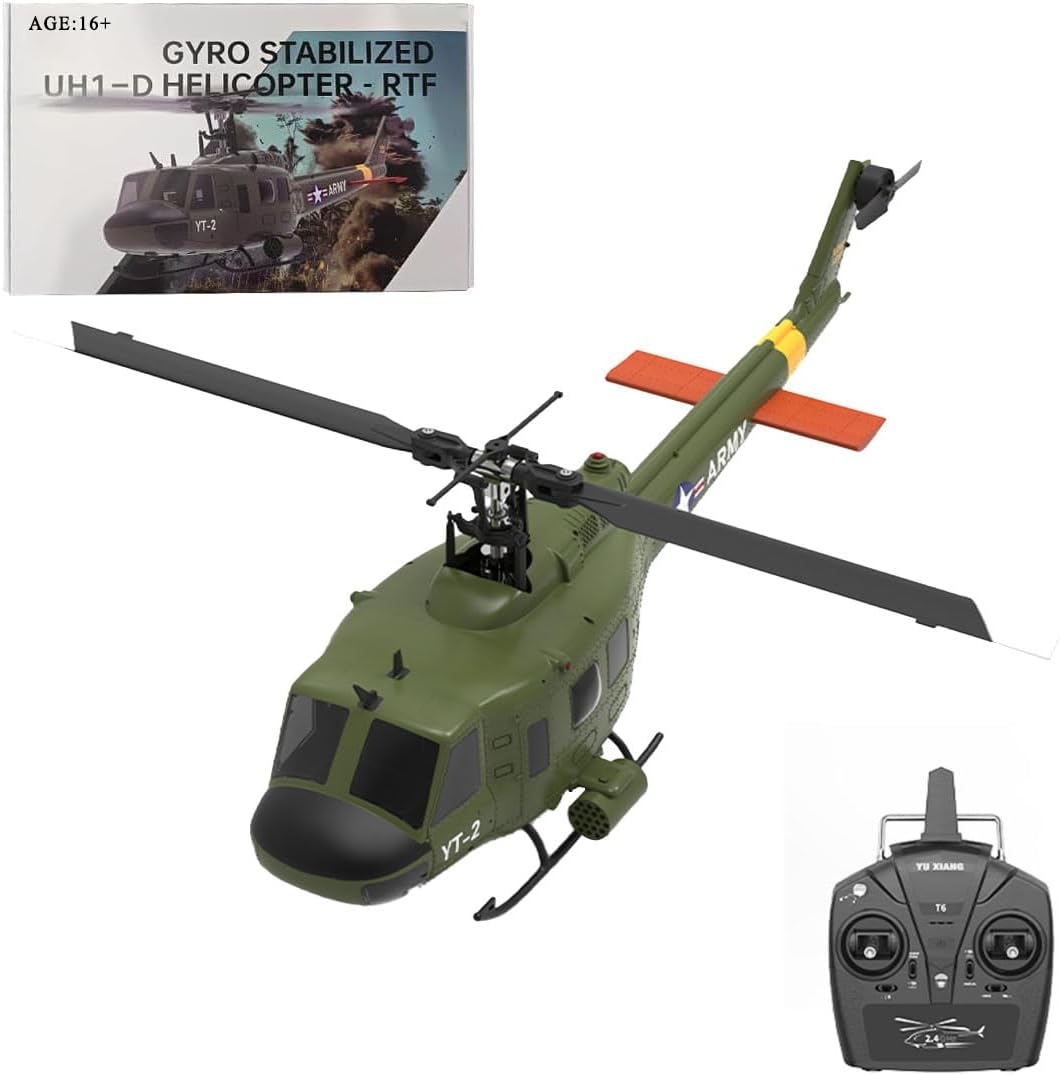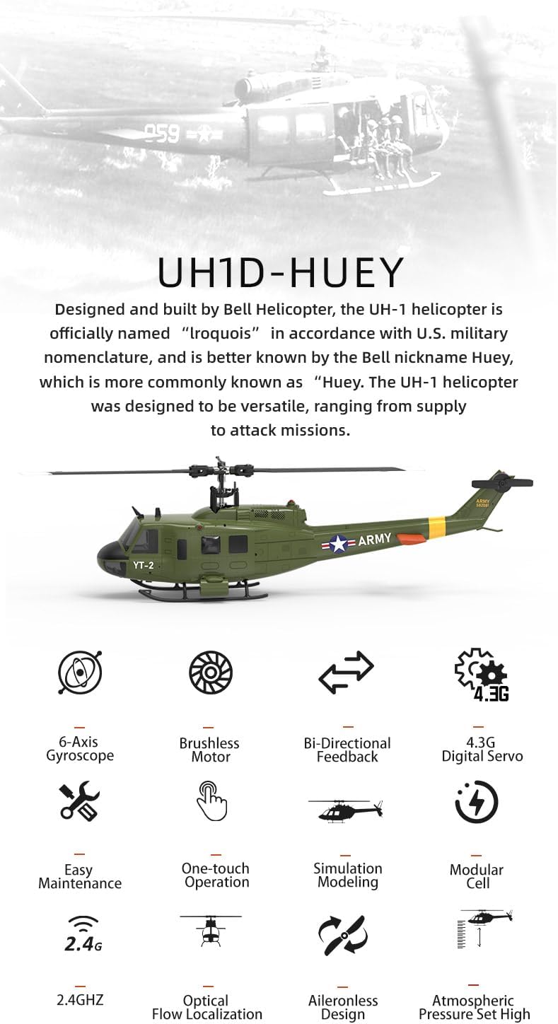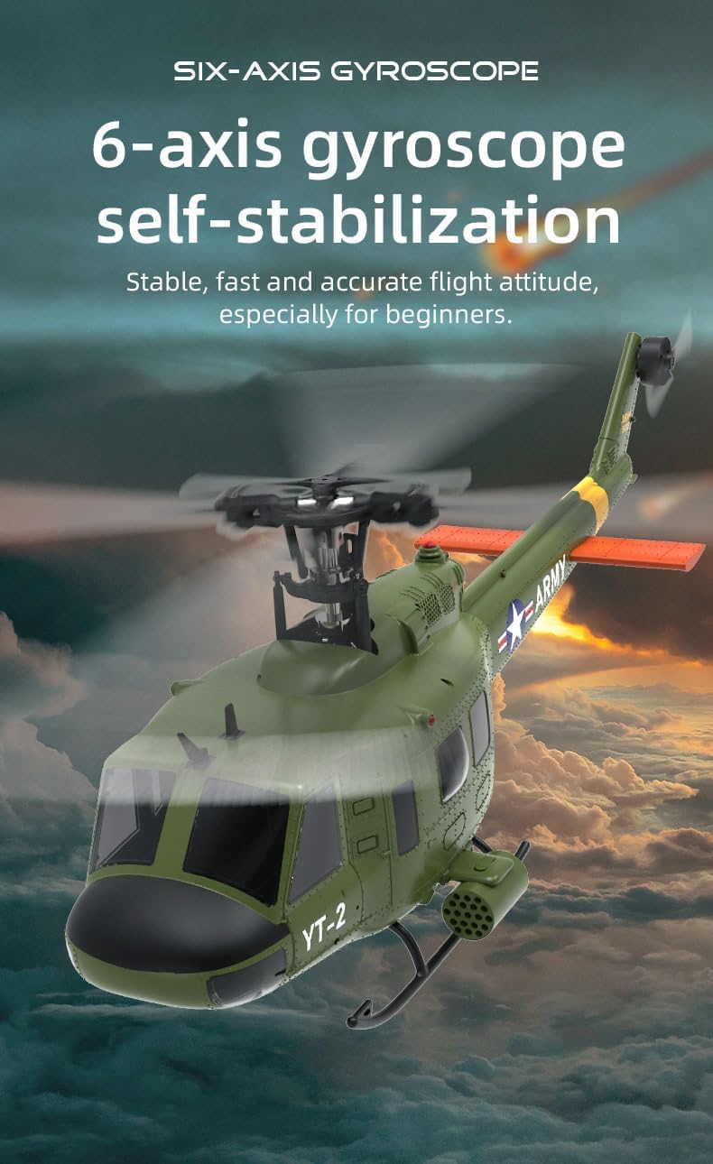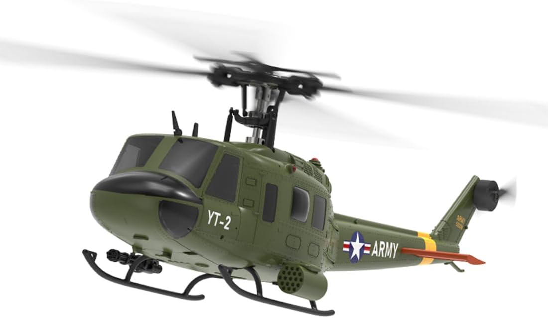 Realistic Design: Based on the iconic Bell UH-1 Huey helicopter, this 1:34 scale model offers highly detailed realistic features with cool lighting effects. It features a flybarless design with a dual-axis driven motor system and an electronic stabilization system for precise control and enhanced flight stability. The optimized structure reduces the risk of damage, making it perfect for enthusiasts.