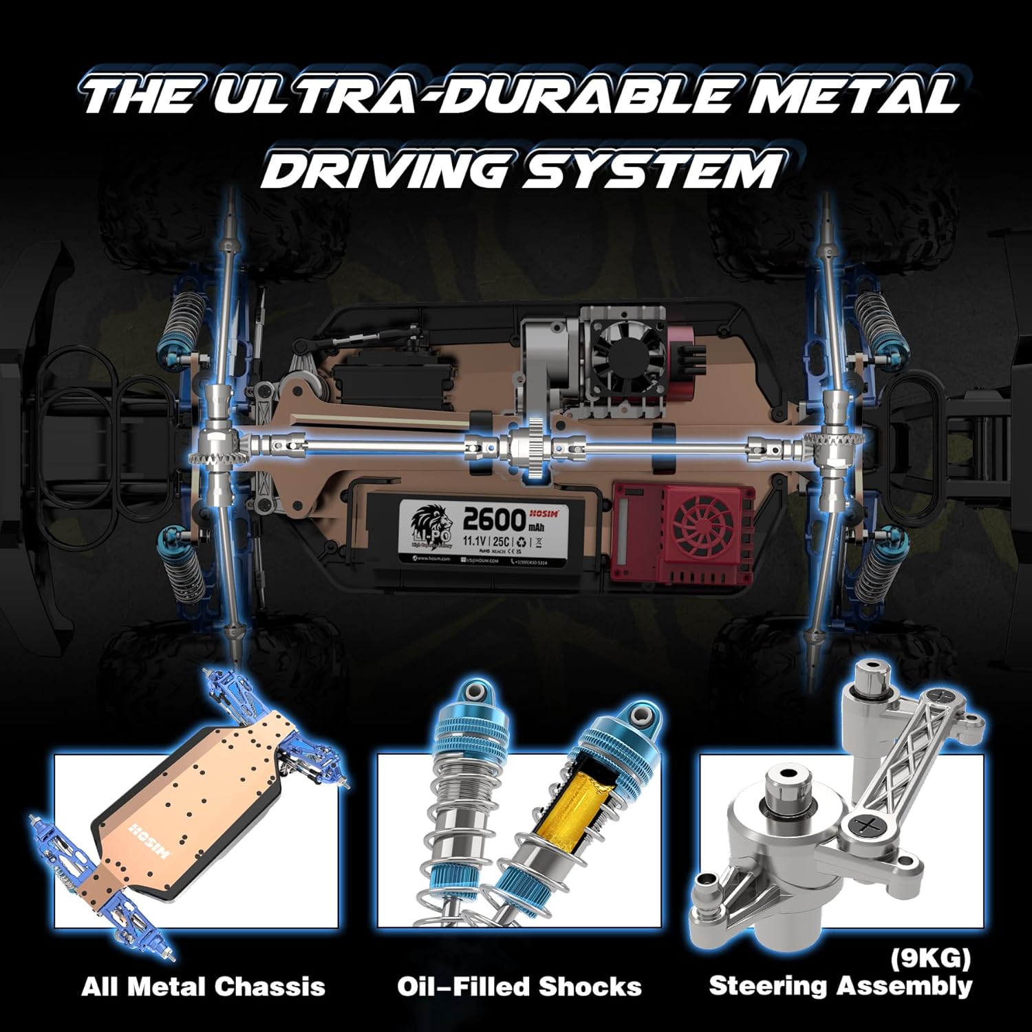 【Metal Hydraulic Shocks & Durable Metal Chassis Construction】The rc racing car features an all-metal undercarriage, metal hydraulic shocks to make the racing vehicle fun on all surfaces. The metal swing arm and adjustable linkage, as well as functional limiting straps, keep the solid axle firmly positioned. LED lighting system, 9KG servos complement the superb drive system of this RC car, and all four wheels are fitted with independent suspension springs for a more agile buggy body.