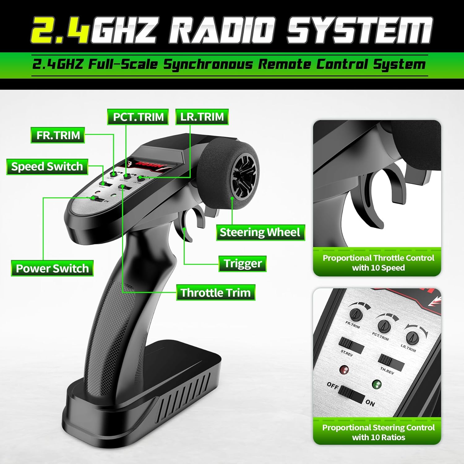 【2.4GHz Remote Control】Fast rc car with 2.4GHz radio control system is sufficient to keep the control range stable up to 320 feet. Reliable forward, brake and reverse drive systems never fail. Waterproof electronics make this radio controlled truck an all-terrain vehicle. Highly responsive steering and throttle, you can race with your friends or kids at the same time.