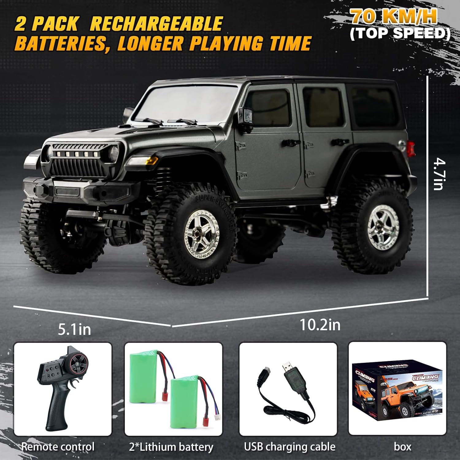[All Terrain RC Rock Crawler]This hobby RC truck for adults is a 4WD rock crawler climbing vehicle that can conquer any terrain. It is capable of running at speeds up to 12km/h and adapts to a wide range of terrain, with metal shock absorbers and suspension that can easily handle rugged terrain such as beaches, snow, grass, mountains, rocks and more