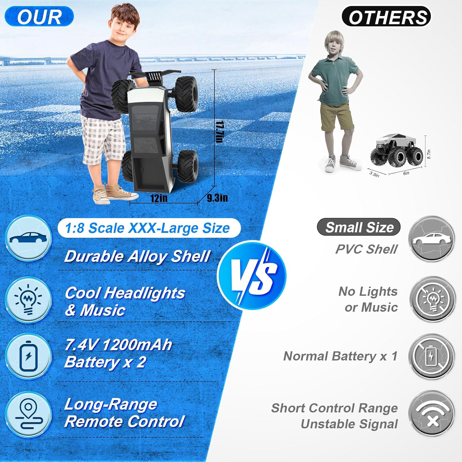 NQD 1:8 Big Cybertruck, XXX-Large RC Cybertruck Toy Model 4WD with Dual Motors, LED Headlight, Music, Alloy Remote Control Truck Off Road RC Car Rock Crawler, 2.4GHz All Terrain Toy Car for Boy Kids
