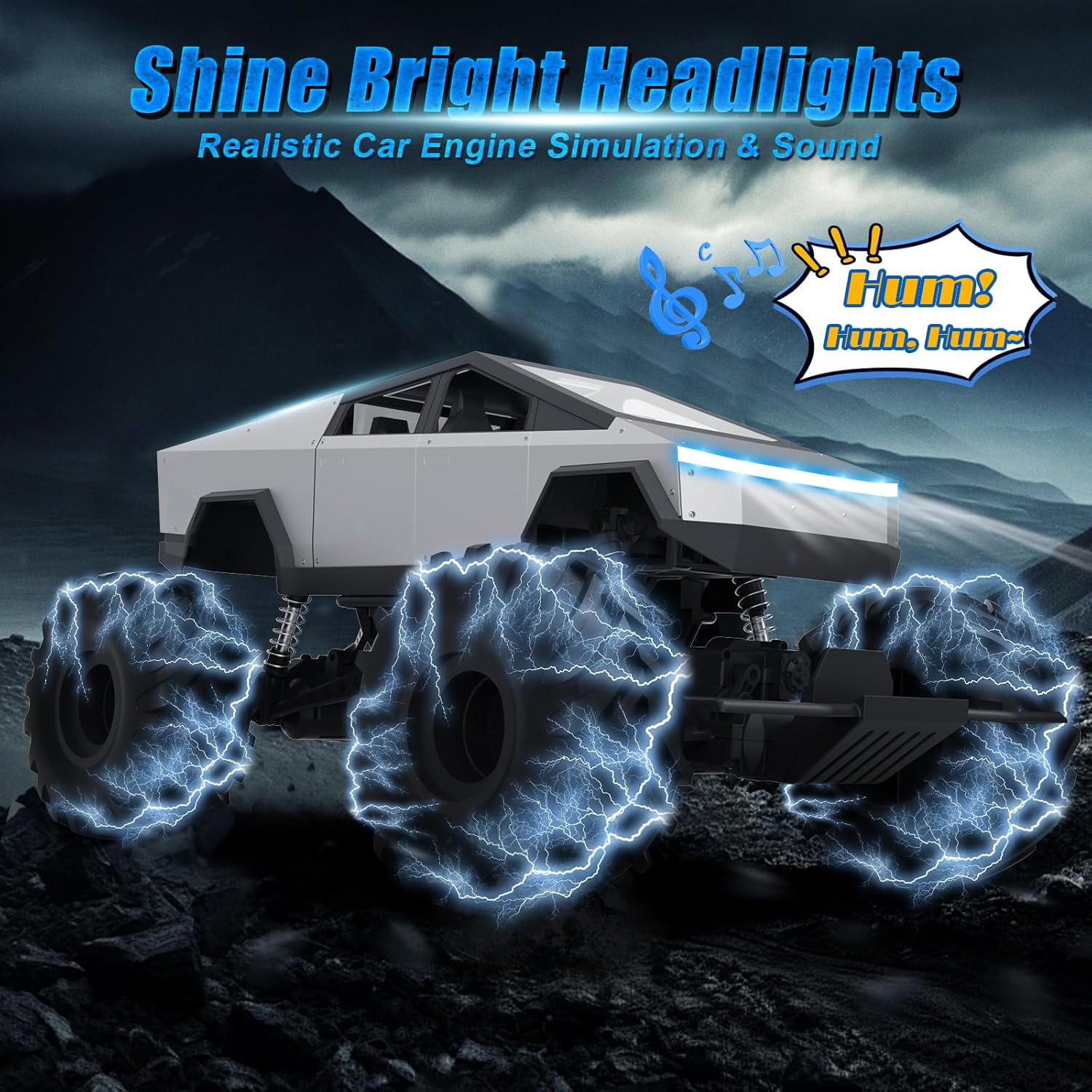 【All-Terrain RC Monster Truck】Tackle any environment with confidence! Our powerful 1:8 scale cybertruck toy car features high-grip rubber tires and a 4WD chassis, effortlessly climbing 75° slopes and conquering grass, sand, mud, or rocky paths. Adventure awaits wherever you go