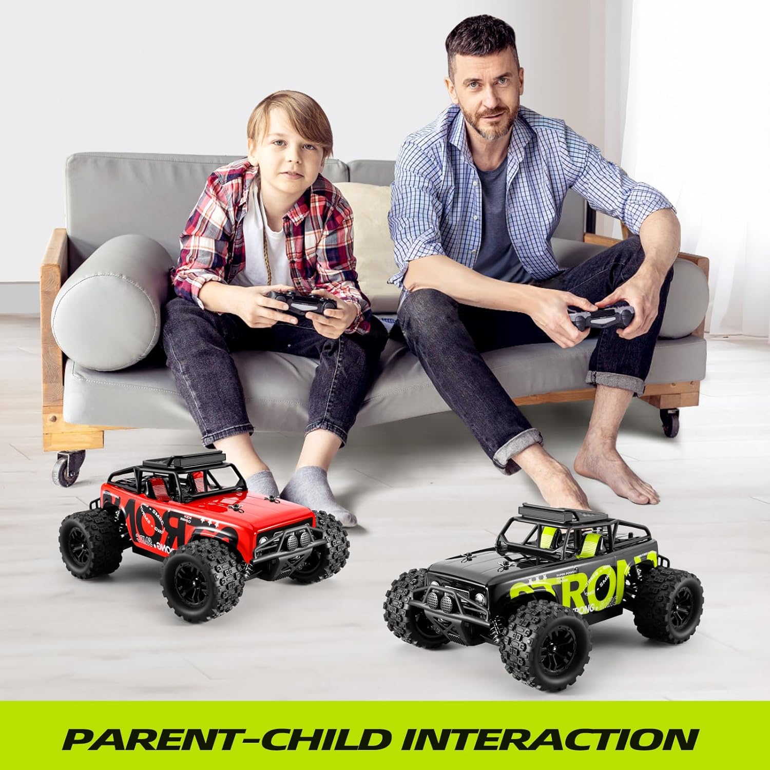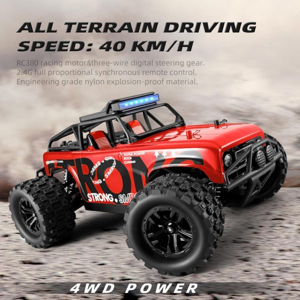 【Off-Road RC Truck】Four-wheel drive, rear differential and large torque motor, combined with grippy tires and independent shock absorbers, make this RC auto suitable for all terrains including sandy beach, country mud, wetland, grassland, rugged mountain road.