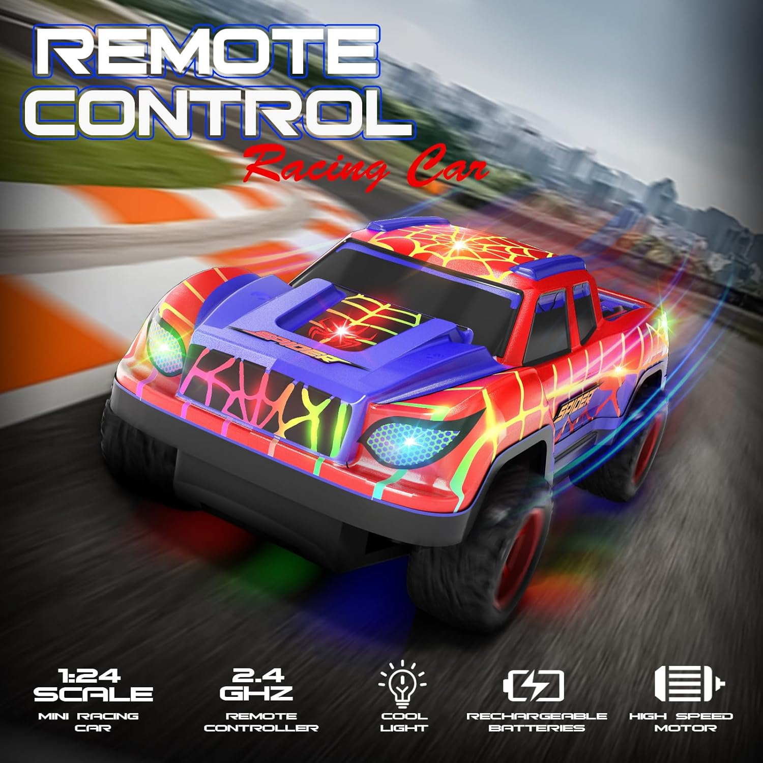 【Cool Lights Spider Remote Control Cars】Get ready for an exhilarating adventure with our rc cars featuring vibrant spider web graffiti and embedded LED lights! Watch as they cast a captivating glow in the dark, immersing kids in the thrilling world of remote control racing.