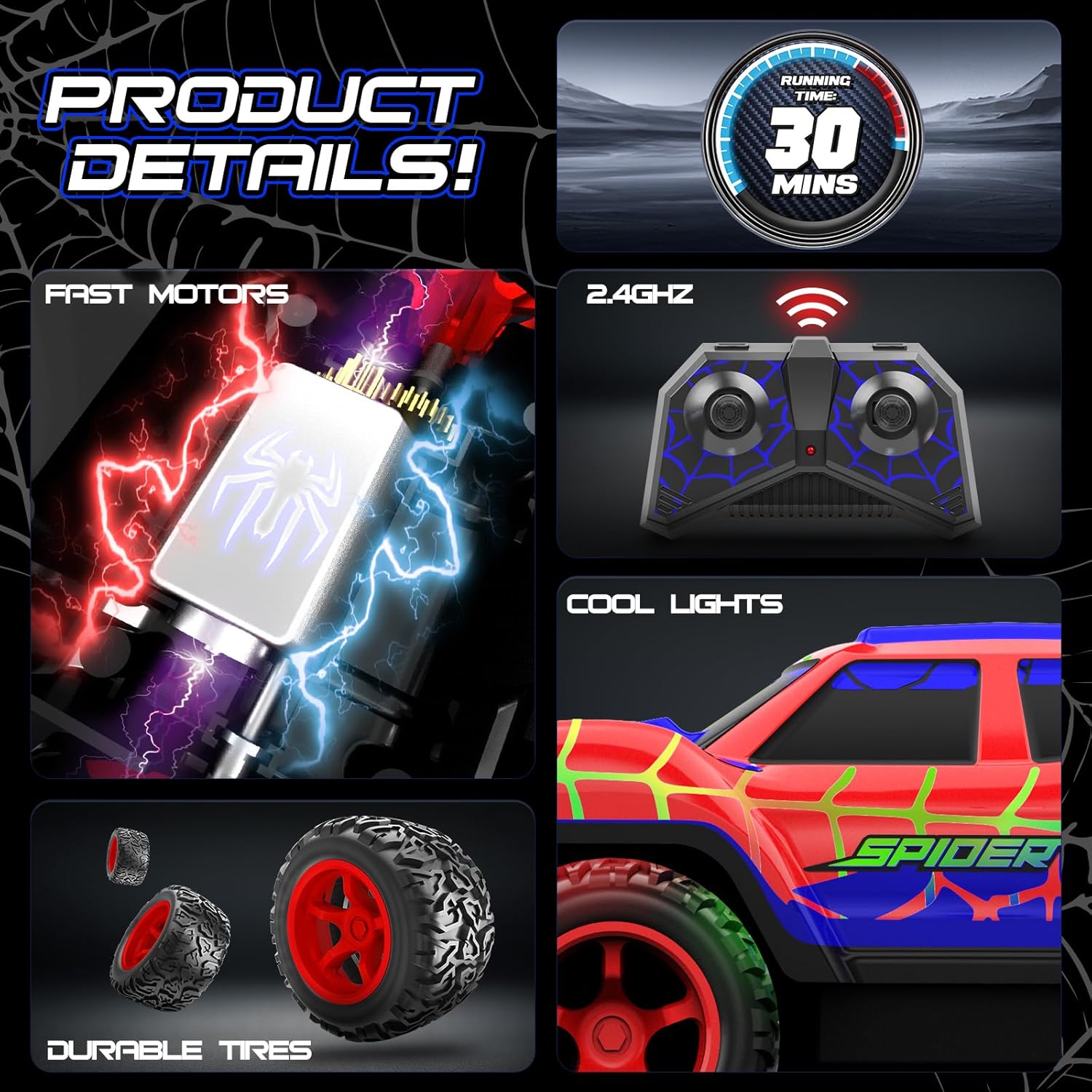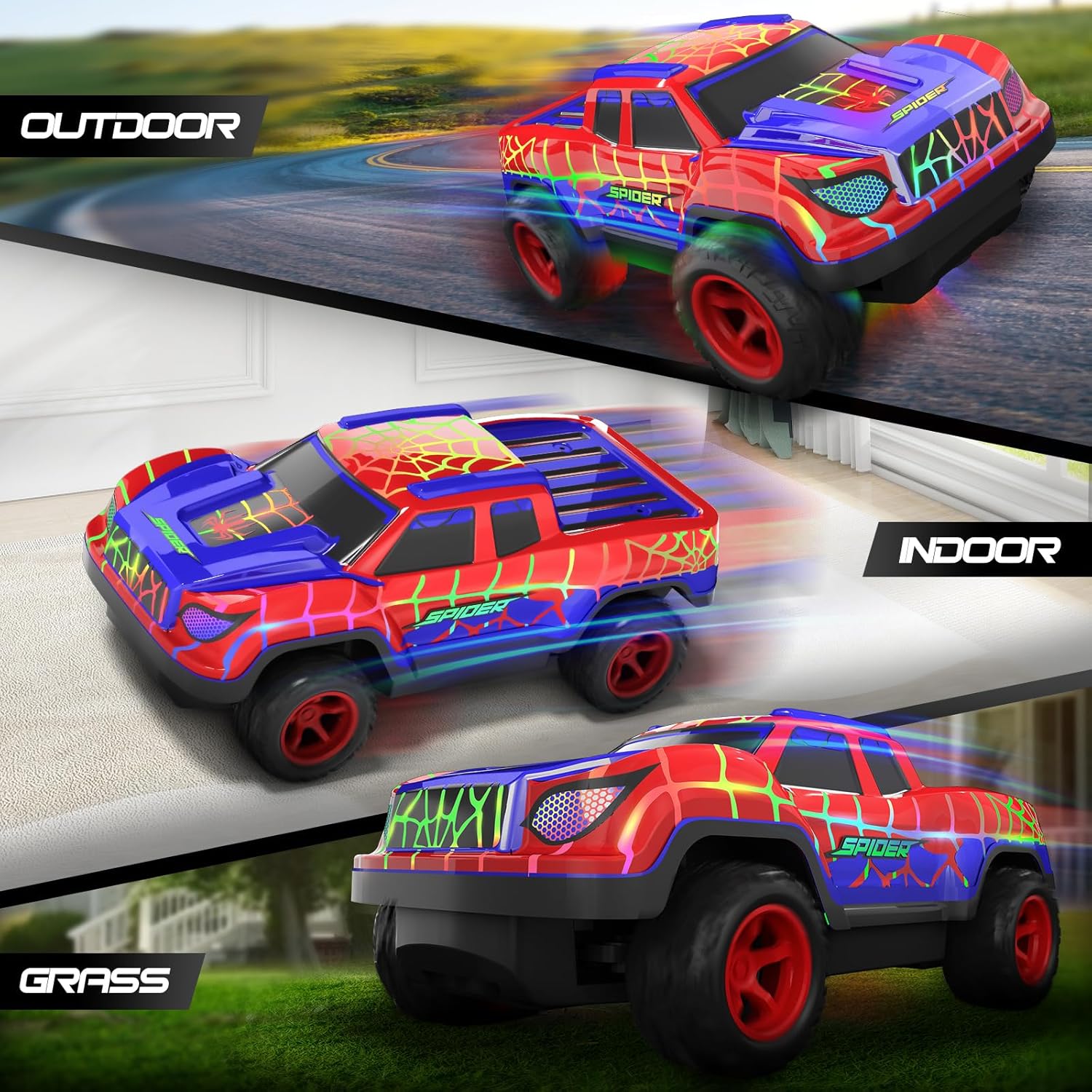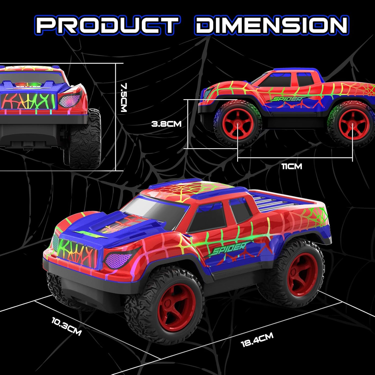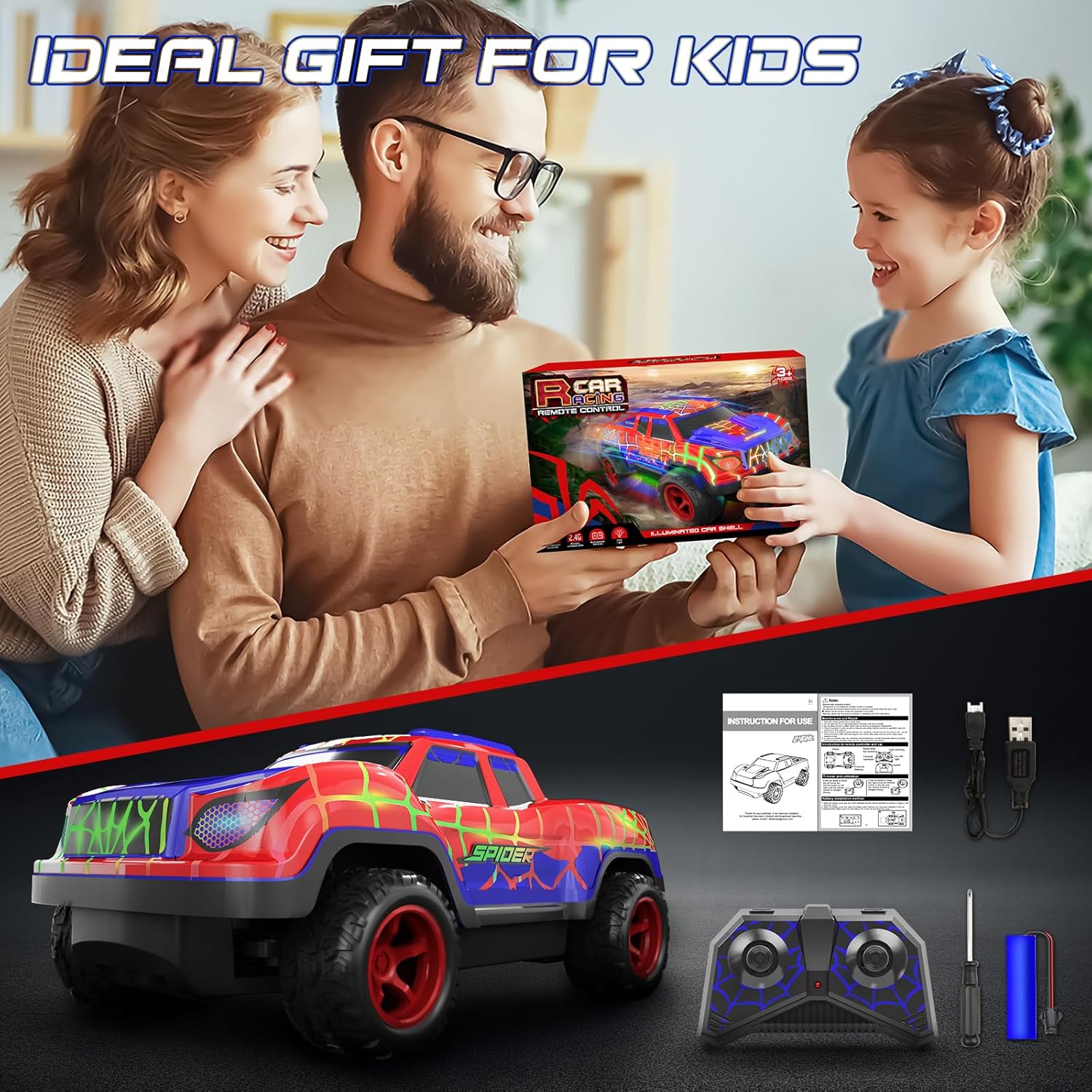 【Perfect Gift for Kids】Searching for the ultimate toys for boys? Look no further! This vibrant spider-themed rc car is an ideal gift for boys ages 3 and up, perfect for birthdays, Halloween, Christmas, or any festive occasion. Get ready for endless fun!