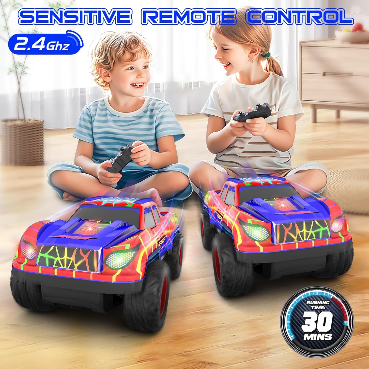 【Multiplayer Fun】Our user-friendly handheld remote, equipped with an upgraded 2.4GHz wireless control system, allows for multiple players to race together! With speed adjustments and light control features, this rc cars for boys makes every race a heart-pounding competition, up to 40 meters away.
